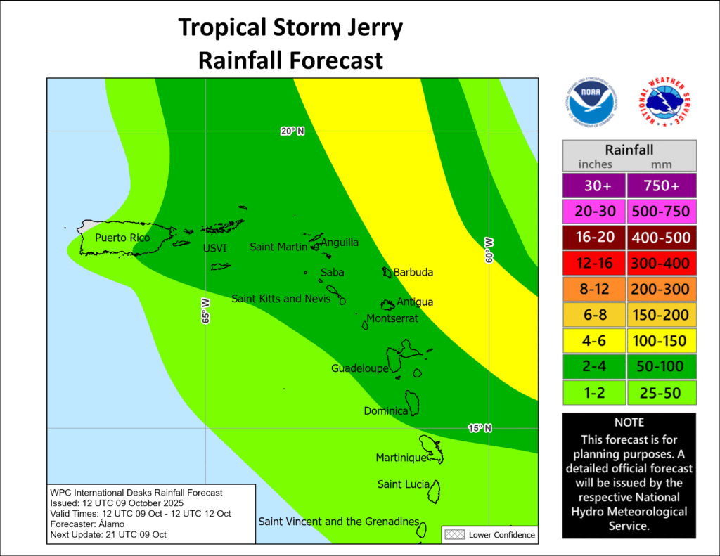 Jerry will begin approaching the northeast Leeward Islands on Thursday afternoon. As it does so, it will slow down, preparing to turn more northward. As this happens, the storm should begin to put itself together better, which will lead to a burst of intensification. Because of the close proximity of the forecast track of Jerry and the likelihood that the storm will strengthen, a Tropical Storm Watch has been issued for a pile of islands: Antigua, Barbua, Anguilla, St. Kitts & Nevis, Montserrat, St. Barthelemy, St. Martin, Saint Maarten, Saba, St. Eustatius, and Guadeloupe.