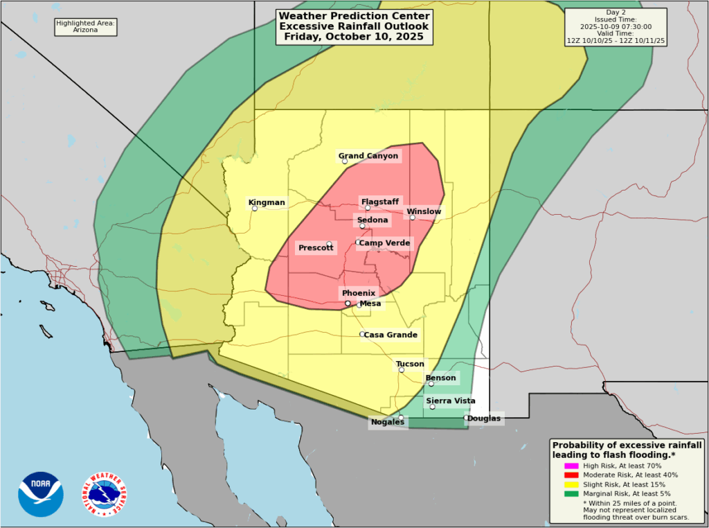 As Priscilla’s remnant come north, they will interact with a rather strong trough that nudges inland from the Pacific, allowing a funnel of moisture to aim into the Desert Southwest. As we’ve been talking about for several days, the potential for locally heavy rainfall is increasing, with slight risks for flooding (level 2/4) now in place from Friday through Sunday in various spots in Utah, Arizona, Colorado, and New Mexico.