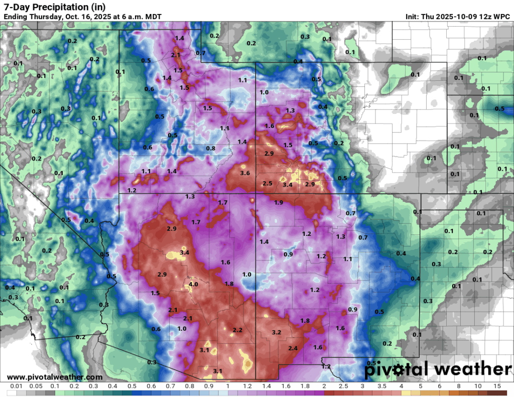 Some models show potential for even higher amounts than this in localized spots. I would expect flood watches to be posted by tomorrow for much of this region, so while the rain is mostly welcome in the long-term here, this could cause some short-term problems, particularly in Arizona and near the Four Corners.