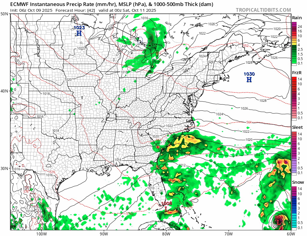 We’ll start today again with the latest on a likely coastal storm that will taunt the Eastern Seaboard from the Carolinas to perhaps New England from Saturday into early next week. There still remain numerous questions on track, intensity, etc., but a few updates today. First, again to be clear, this will not begin as a tropical system. This is going to be like a winter nor’easter (minus the snow) in terms of how it develops. As it interacts with the warm water off the Carolina coast, it could begin to take on a “flavor” of a tropical-type system.