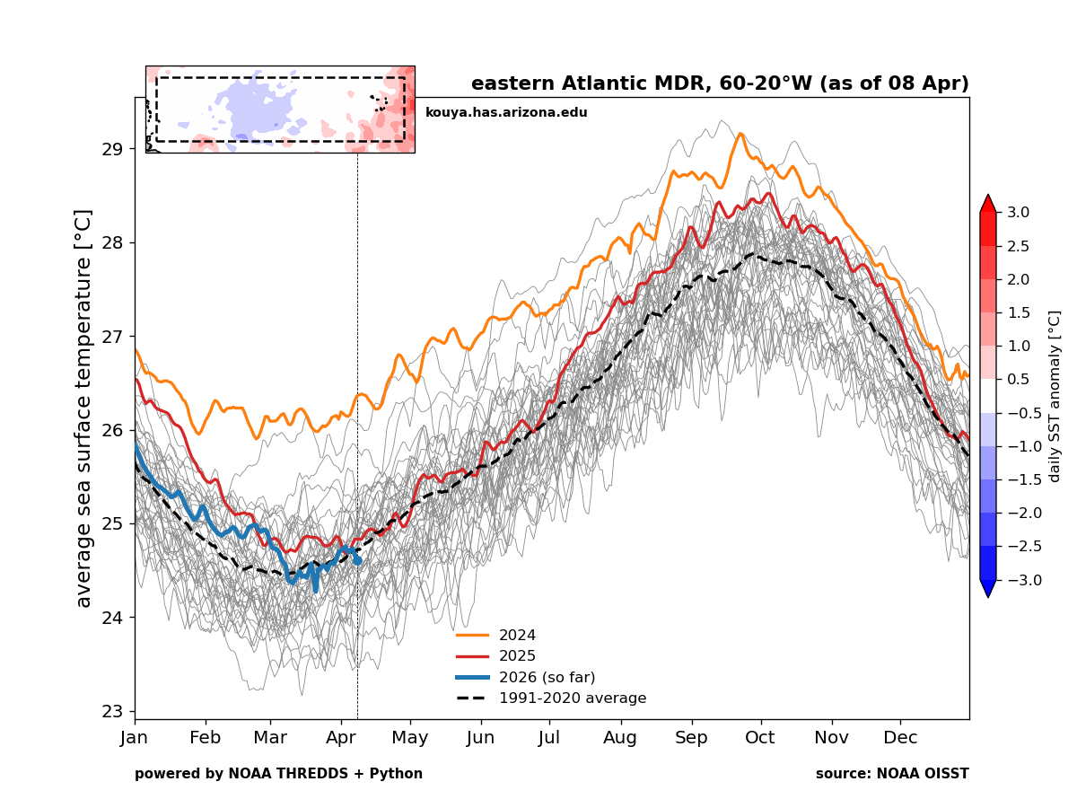The most prominent hurricane outlook of 2026 was released today, as Colorado State University’s experts unveiled their expectations for the 2026 Atlantic Hurricane season. You can read the full report here, or a nice summary from Michael Lowry here. Bottom line? They’re calling for a slightly below average season of activity, which would be the weakest in over a decade. Justifications include the developing El Niño and less warm water in the Atlantic than we’ve seen in several years. The Atlantic MDR, main development region is close to 2025 levels and well off 2023-24 levels, which were extreme.
