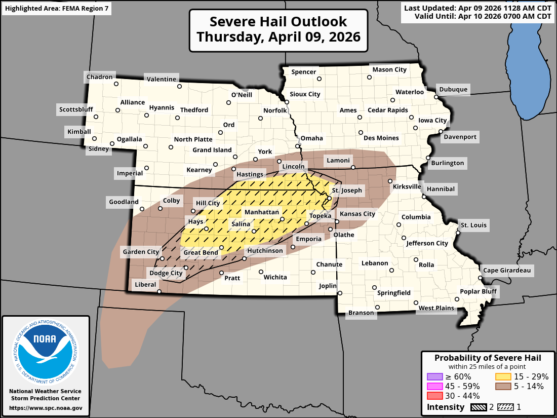 Large hail risks including Topeka, the Little Apple, and St. Joseph, MO. (NOAA SPC)