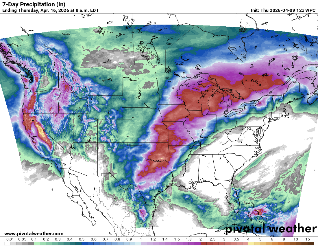 Widespread 1 to 4 inch rainfall totals are expected from North Texas into the Great Lakes and southeast Canada over the next week. (Pivotal Weather)