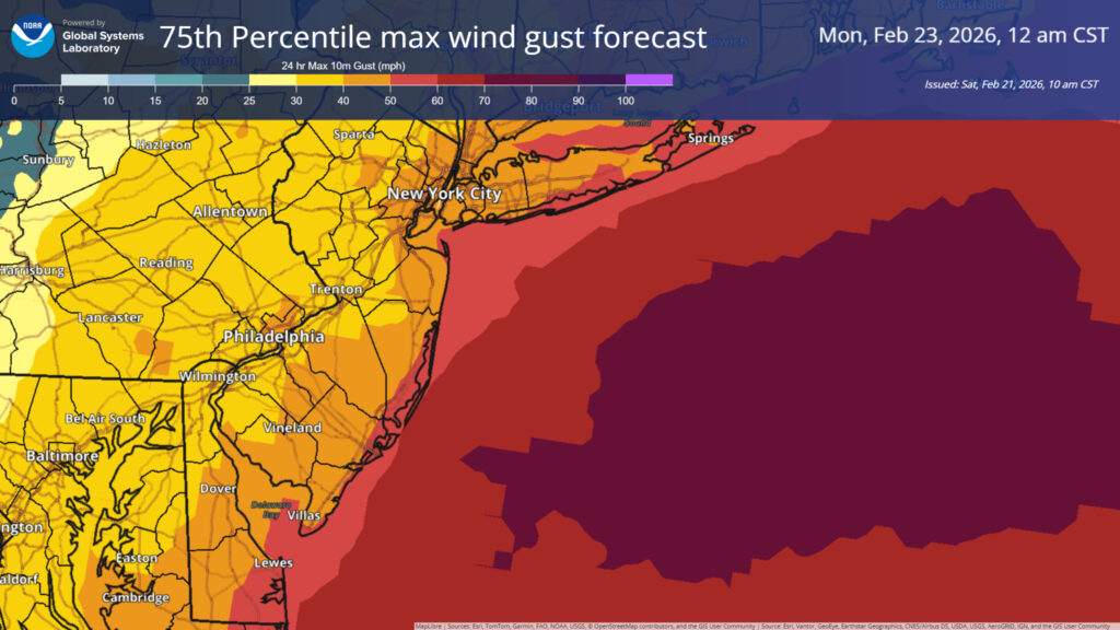 The onset of snow should be Sunday morning, although it may start as rain in many spots. As a South Jersey native, I can assure you that there’s always some uncertainty as to how long it takes for rain to change to snow there, but at present, the models think this will occur by early afternoon on Sunday. From that point, the storm system is going to rapidly deepen off the Jersey Shore and Delmarva, possibly bombing out, deepening at least 24 mb in 24 hours. Regardless, this will lead to the wind cranking out of the northeast. Wind gusts will top off probably in the 50 to 60 mph range, but some higher gusts cannot be ruled out. A good idea to charge your electronic devices on Sunday afternoon in case you lose power.