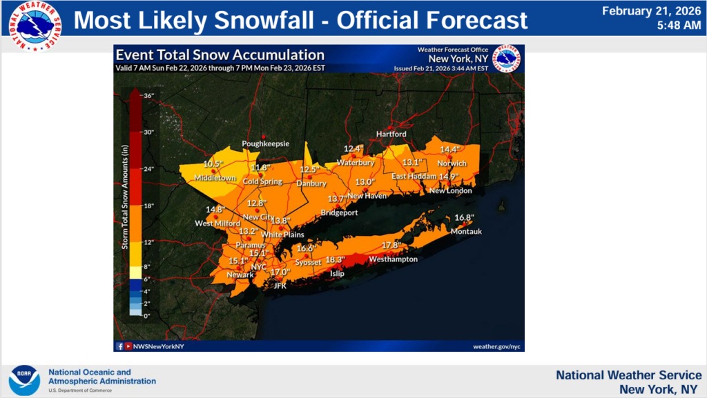 Heavy snow will expand into New England as well, with significant snow likely in the southern half of Connecticut, Long Island, and Rhode Island.