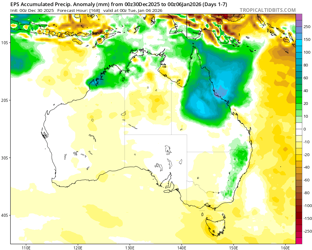Much of the rain in northwest Queensland has fallen over the last week or so, equivalent to nearly their entire annual rainfall. Rain totals have been on the order of 600 mm (23 inches) in spots. Rainfall looks to continue above normal over the next week, though the most anomalous totals may pass just east of the hardest hit areas in Queensland.