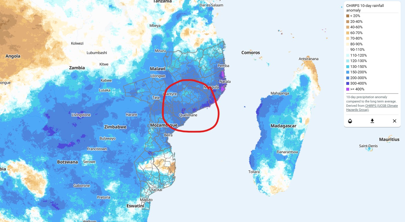 Heavy rainfall is occurring in parts of Mozambique, which has led to flooding and will likely produce continued flooding in the country. The most significant of the flooding has occurred in the Sofala and Zambézia Provinces, highlighted on the map below. Some parts of coastal Mozambique have seen over 400 percent of normal rainfall in the last 10 days.
