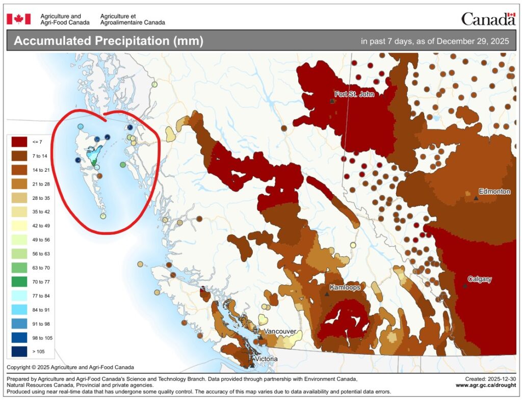 Flooding is a good deal worse on the West Coast, with parts of the North Coast in British Columbia seeing severe flooding. There are road washouts in the Haida Gwaii Archipelago. One of the road washouts was a critical north-south route on the main island. That area is emerging from a multi-day moderate atmospheric river event.