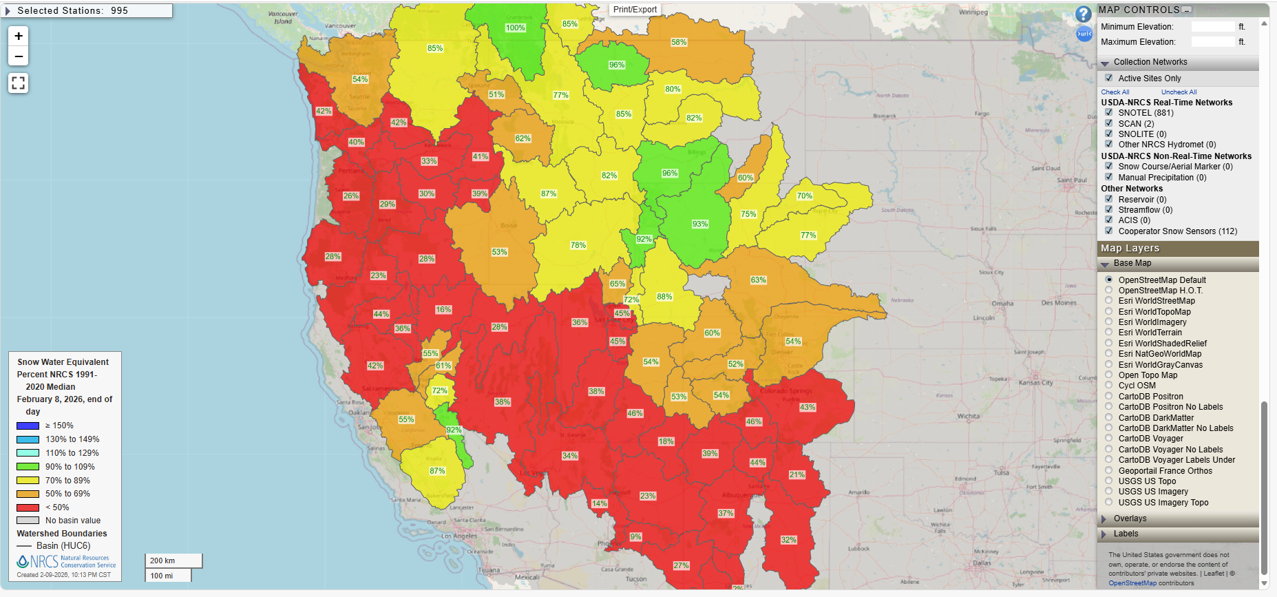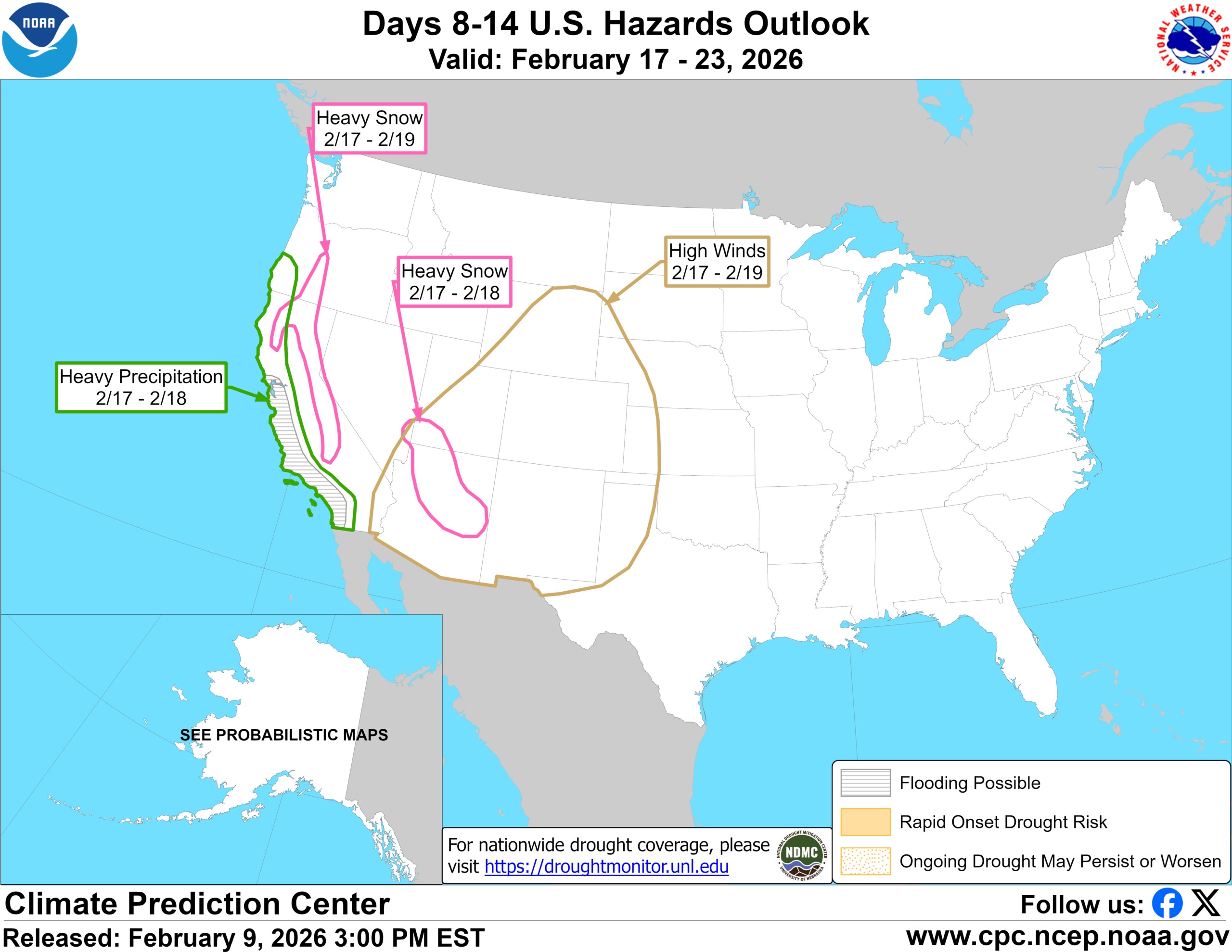 The Climate Prediction Center’s 8-14 day hazards outlook has begun to paint the West more colorfully since Saturday. The heavy precipitation and heavy snow cards are being dealt for Feb 17-19 with the storm(s) next week. When all is said and done, we could be looking at 5 to 10 inches of liquid equivalent in California and 1 to 3 inches in portions of Nevada, Utah, Arizona, and western Colorado. Anything would help. This won’t be enough to salvage the winter (we need more), but it will hopefully help pull back the extremes a little. Here’s hoping.