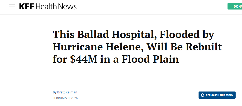 The Unicoi County Hospital in Tennessee flooded so badly during Helene that patients and staff had to evacuate to the roof and be rescued by helicopter. The decision is being made to rebuild the hospital right in the flood plain of North Indian Creek, a location that may be even worse than where it was originally built. There are safe ways to do this to ensure flood impacts are mitigated, but unfortunately, Ballad Health did not offer comment for this article. This doesn’t make me angry because rural health systems struggle enough as it is, and it’s more important to offer those residents access to healthcare than it is to worry about everything else. Theoretically. But it frustrates me that organizations like this are being put in this position at all. Surely, there have to be many other, less flood prone locations to build this facility. When we talk about resiliency and building smartly, which we should be doing in 2026, no matter your belief structure on climate change, this is exactly what we don’t want to see happening. Risk is never zero, of course. But some risks are very clearly worse than others, and this decision feels as if it feeds into that idea. It’s hard enough for rural health systems to survive on a good day, let alone with elevated risk. They need help with ways to build smarter.