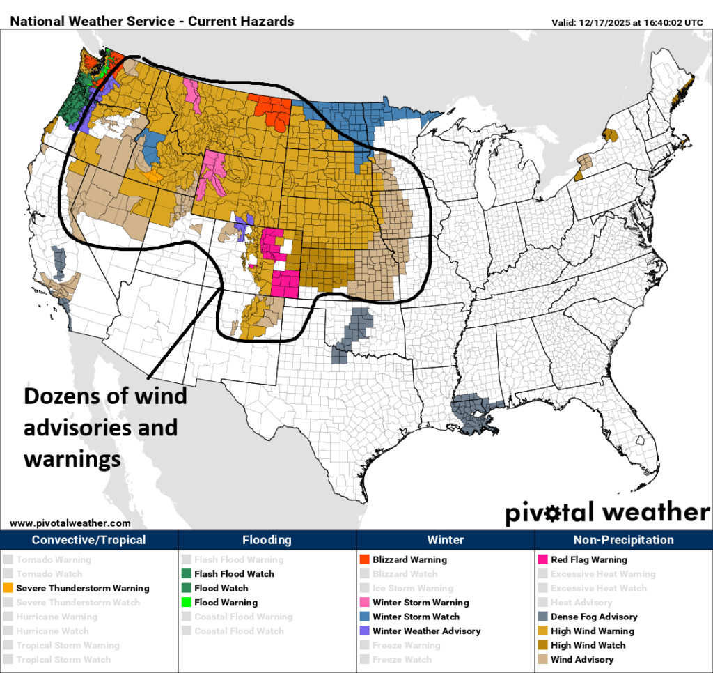 The big story over the next several days into next week will be another atmospheric river event on the West Coast. Note that NCAR does work to support atmospheric river reconnaissance research that helps improve forecasts of these events. This event is taking aim at the Pacific Northwest right now, where we have numerous watches and warnings posted for flooding (thankfully not as bad as last week), heavy snow, blizzard conditions, and strong winds. In fact, the footprint of wind advisories and high wind warnings is tremendous, extending from the Northwest into the Northern Rockies and Northern Plains.