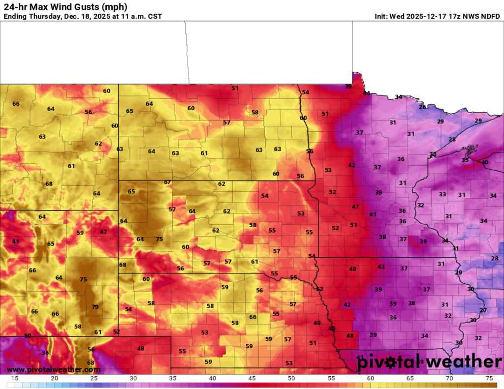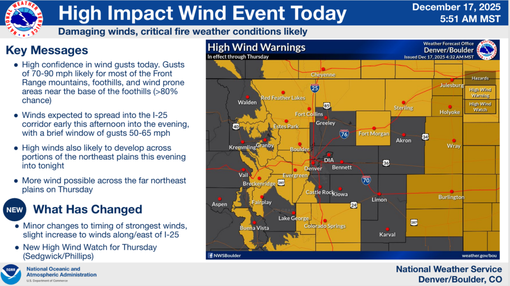 One specific area to watch closely today will be the Front Range in Colorado where gusts of 70 to 90 mph will be possible in the higher terrain and wind-prone bases of the foothills. Winds could gust as high as 50 to 60 mph in the Denver area as well later today.
