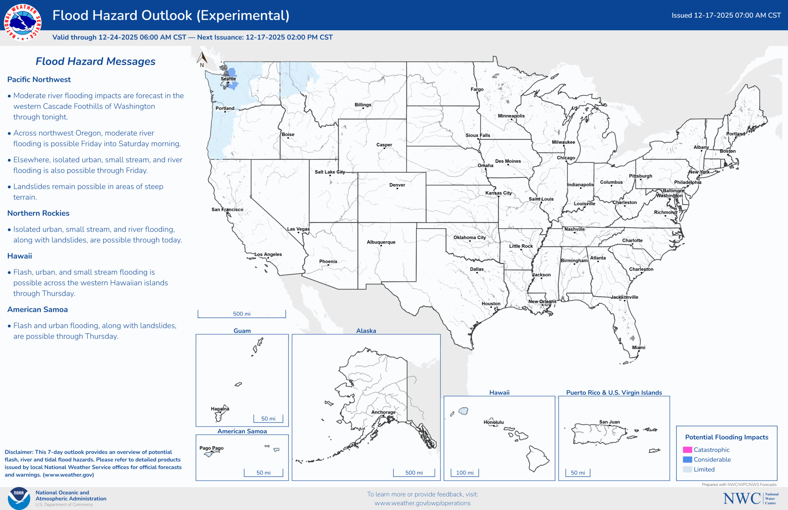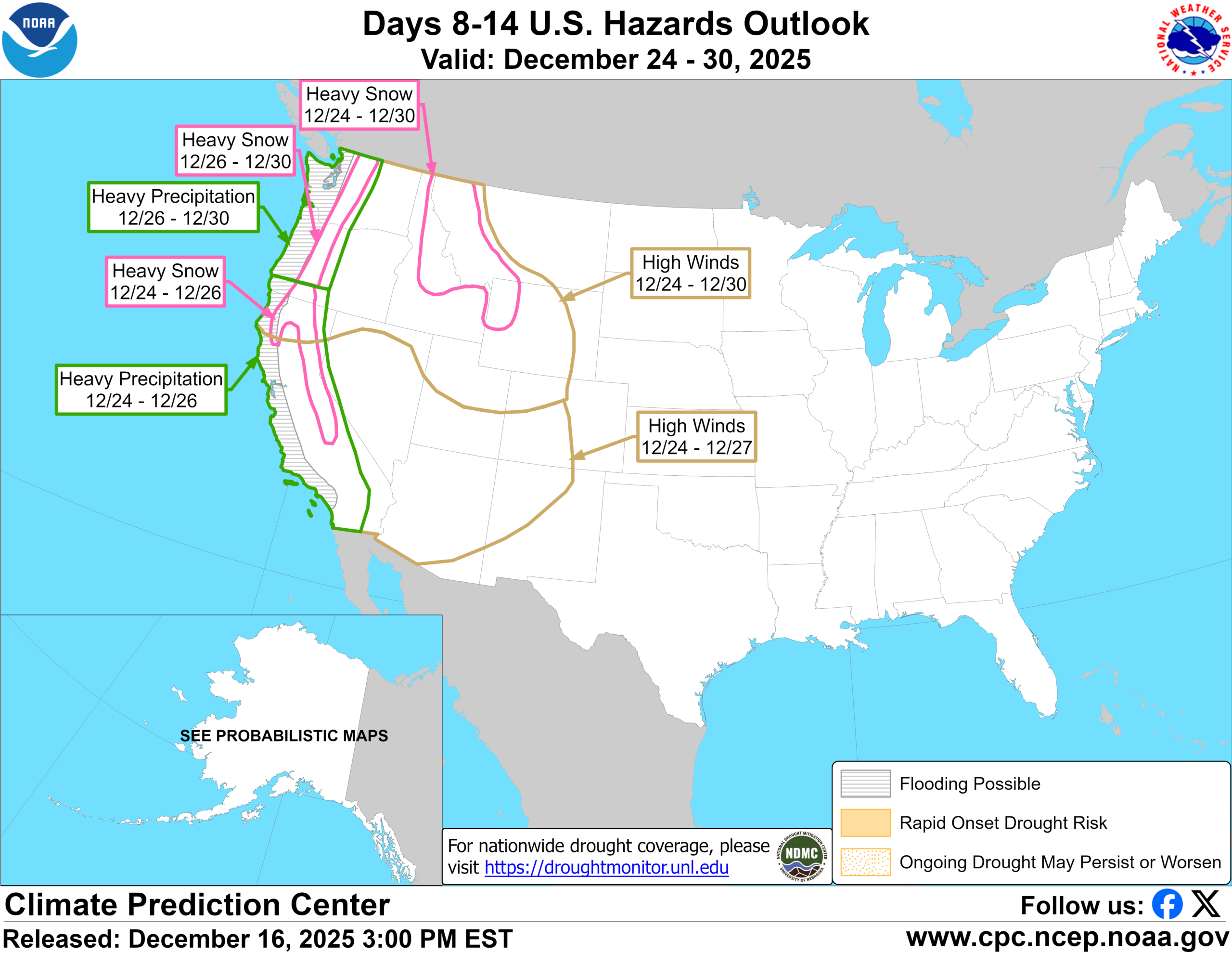 For California, the next few days will see varying levels of moisture move in, heaviest in far northern California on Friday and for parts of northern and central California on Sunday. The bigger story may be what’s coming next week, where a major storm could overtake all of California, including SoCal. This is highlighted on the 8-to-14-day hazards outlook from Tuesday, showing Christmas Eve, Christmas Day, and Friday in play for a potentially significant rainstorm and Sierra snowstorm.
