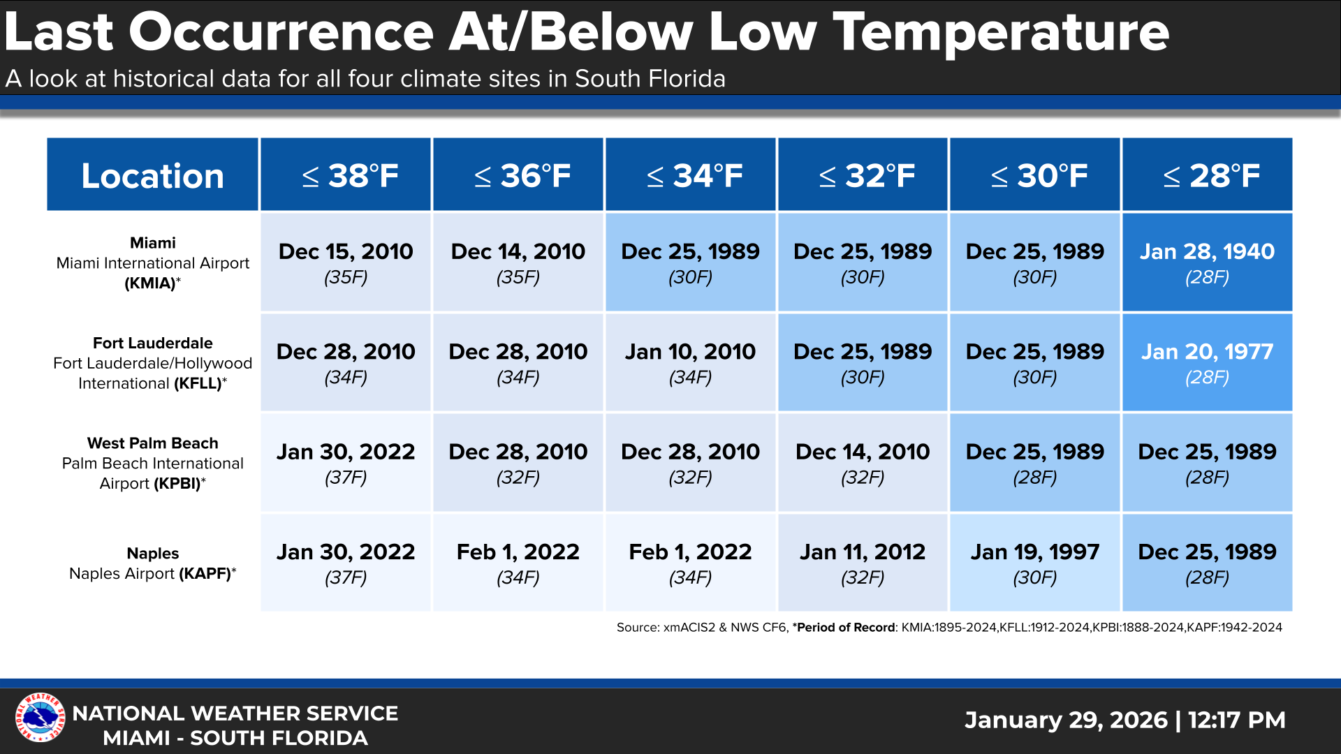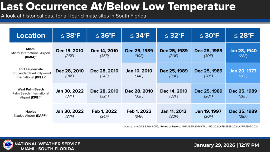 For Miami, the morning low of 35° was the coldest since January 10, 2010, when they also hit 35 degrees. Prior to 2010, it last happened on January 21, 1985, when it was 34° in Miami. The wind chill of 26 degrees in Miami at 7 AM appears to be the first time that’s happened since the great cold outbreak of Christmas 1989.