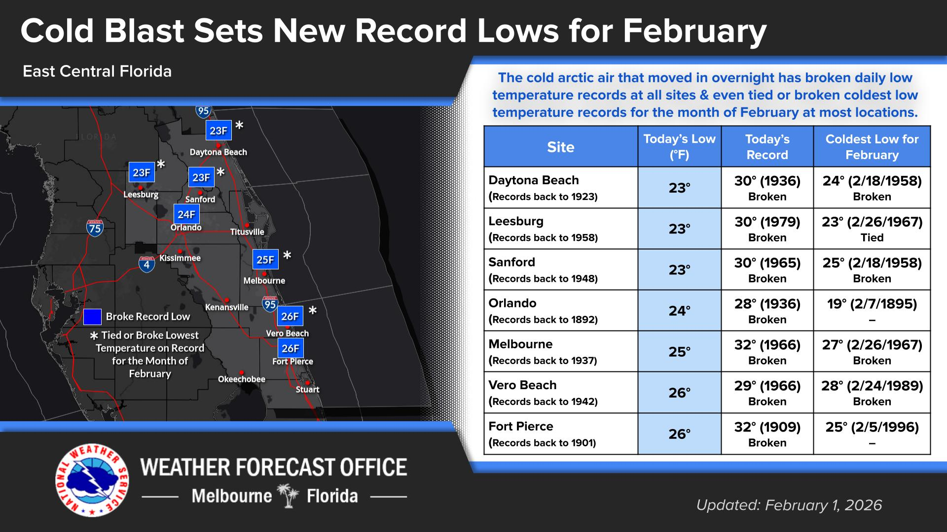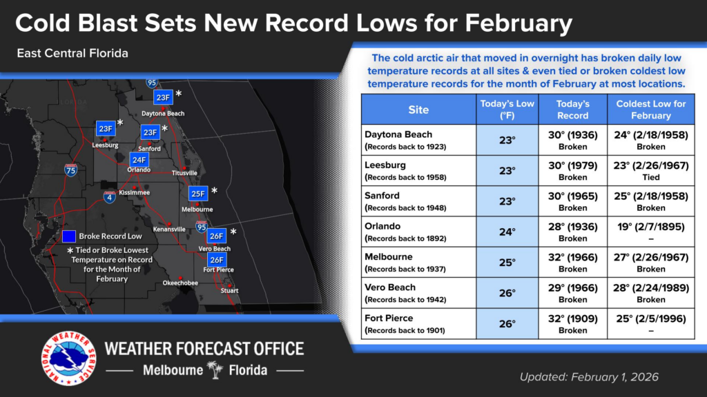 In Orlando, the morning low of 24 degrees was last seen on December 29, 2010 and prior to that Christmas Eve 1989. For Daytona Beach, the 23° morning low was coldest since Christmas 1989. This was also the coldest February morning on record there. Vero Beach and Sanford also had their coldest February mornings back to the 1940s or 1950s as well.