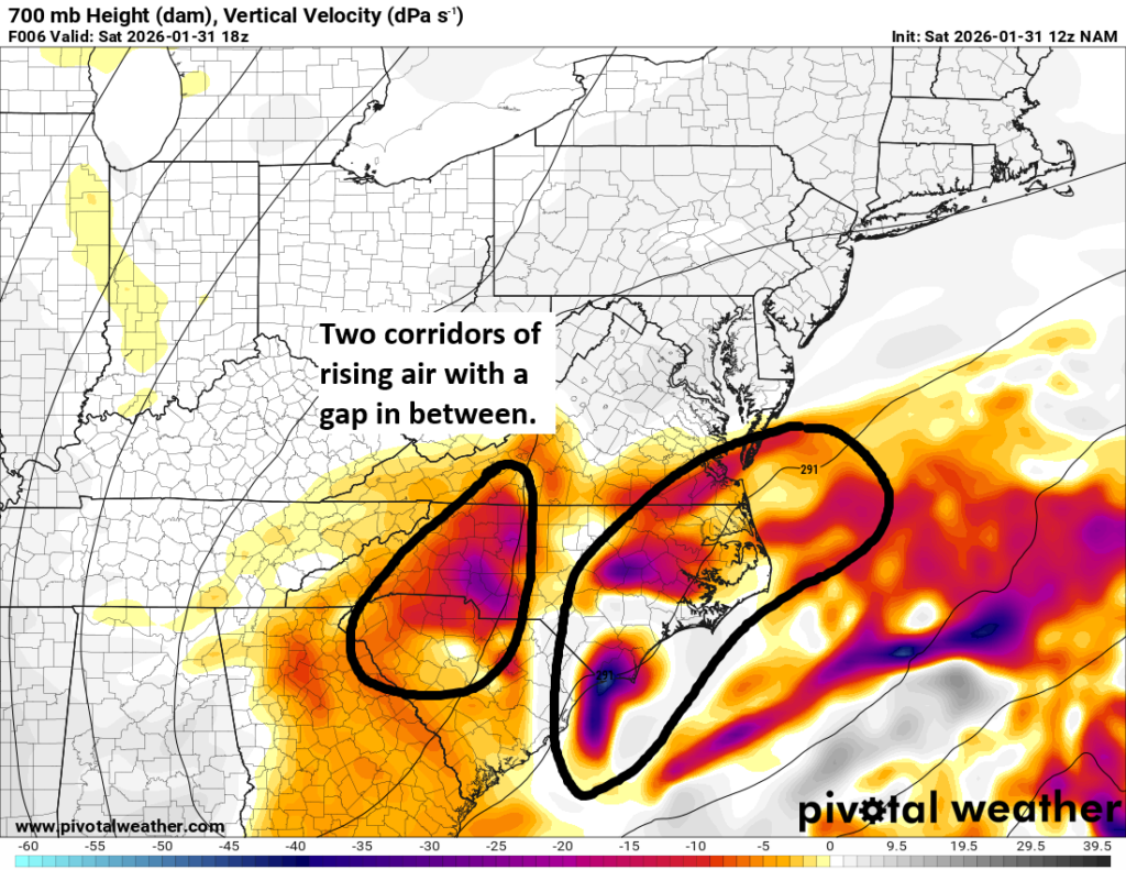 You aren’t going to look at this and say, “Raleigh is going to get no snow,” but it does at least show a slightly better visual of the potential of a vertical velocity minima/subsidence in the atmosphere that would “gap” an area from seeing heavier snow. It’s not as if this was clearly defined or setup the day before. There were hints of something down toward Fayetteville or the Pee Dee in South Carolina on Friday morning. That shifted closer to the Triad with Friday afternoon’s model guidance. But you aren’t going to look at that alone and sketch a forecast that granular in nature and feel confident. It’s just the challenging nature of these snowstorms.