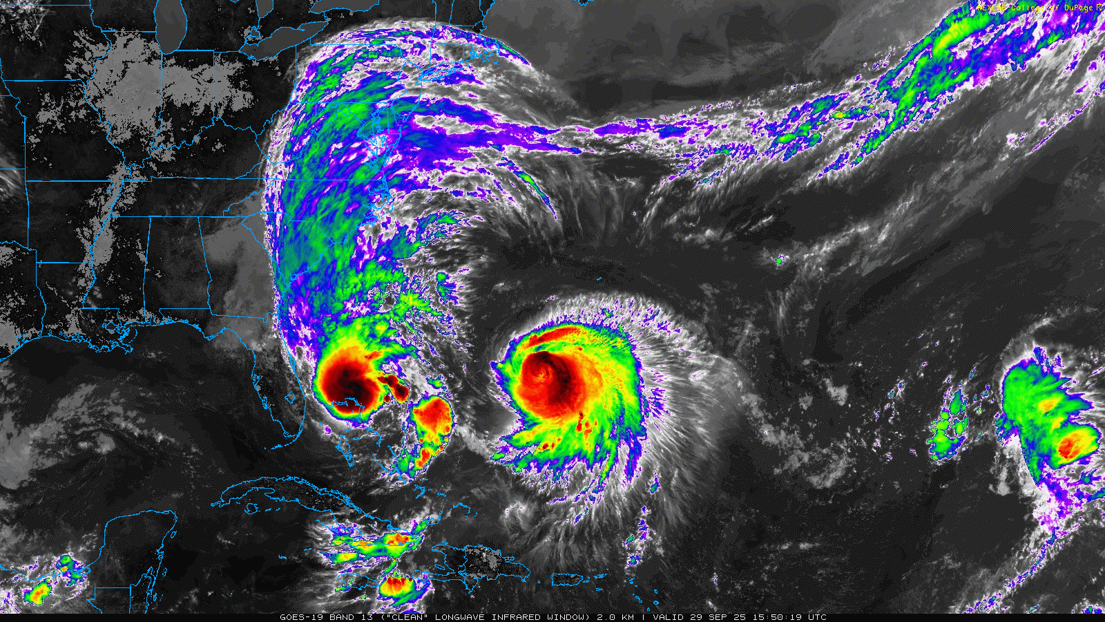 And, frankly, it’s not even close. We did see them both interact with one another yesterday in a somewhat interesting way, via a bit of a Fujiwhara effect. You can see that on this satellite loop from the College of DuPage. If you look closely, you see Humberto get pulled back north and west a smidge on Tuesday, as Imelda begins to undercut the storm.