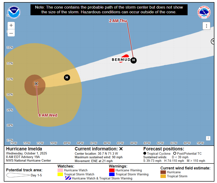 Imelda is a strong category 1 storm, headed for category 2 eventually later today. Obviously, a hurricane warning is in effect for Bermuda, and conditions are expected to deteriorate later today.