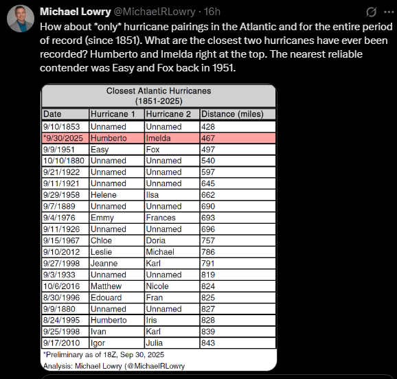 But is interesting to see the model data showing Humberto and Imelda basically in a little cocoon together last night into today before Humberto just gets wrecked. A fascinating meteorology unfolding in the Atlantic that may make someone’s dissertation one day.