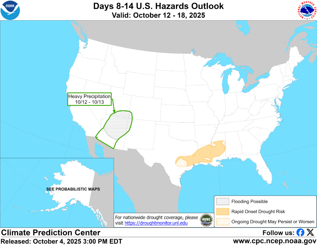 If this does happen, we could see it merge with an incoming trough of low pressure in the upper atmosphere around next week in the Rockies. That would draw most of the remnant moisture north and into the Southwest bringing some potential for locally heavy rain. This is highlighted on the Climate Prediction Center’s 8 to 14 day hazards outlook from Saturday.