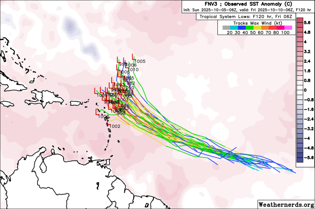 Model agreement on this general theme is actually strong; there’s a little less uncertainty with this system than there has been with various systems of late. At this point, it seems likely that Invest 95L is going to turn north into the Atlantic before it gets to the Caribbean islands, but interests in the northeast Caribbean from Puerto Rico to about Martinique should continue to at least follow the progress of 95L this week. You can see from Google’s AI ensemble that over 90 percent of model forecast tracks stay north of the islands by Thursday night, but there are 1 or 2 that stay fairly close.