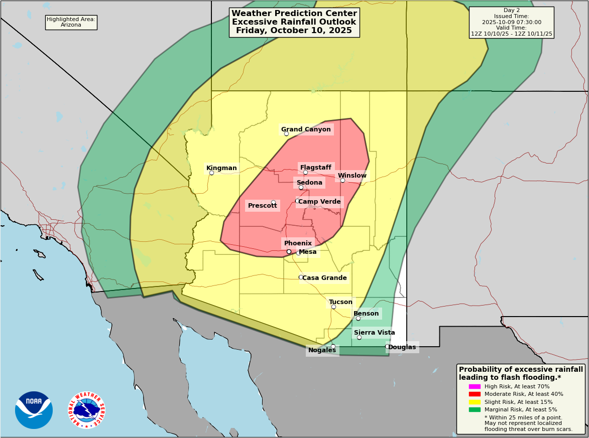 Much of interior Arizona is in a moderate risk (level 3/4) for excessive rainfall and flooding tomorrow. Slight risks (2/4) cover much of the rest of the region including for today and Saturday, as well as Sunday and Monday in southeast Arizona and New Mexico. Moisture surges north today and tomorrow, peaking in interior Arizona tomorrow afternoon into Saturday before sagging back south again Sunday and Monday.