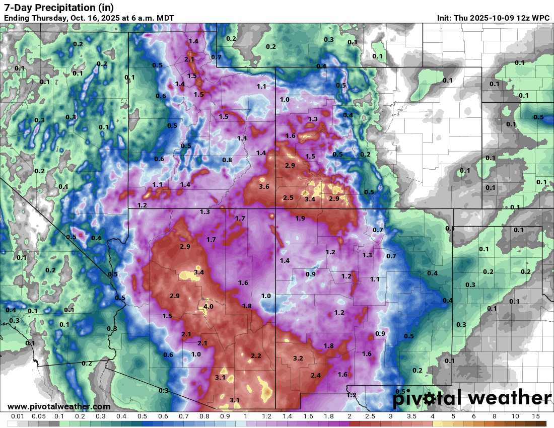 All told, we could see as much as 2 to 4 inches of rain across Arizona, portions of southwest Colorado, and Utah. Additional heavy rain will be possible into New Mexico heading into the weekend.
