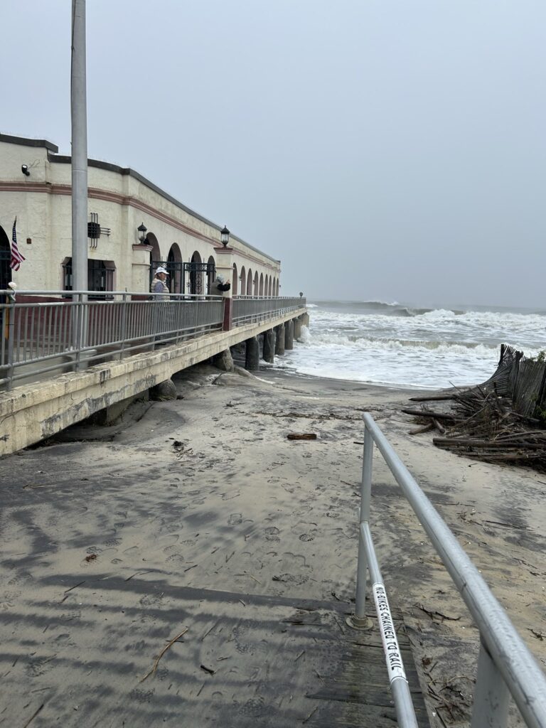 Beach erosion evident in Ocean City, NJ yesterday; beach normally extends out several posts further on the Music Pier. (Pic via author’s mother)
