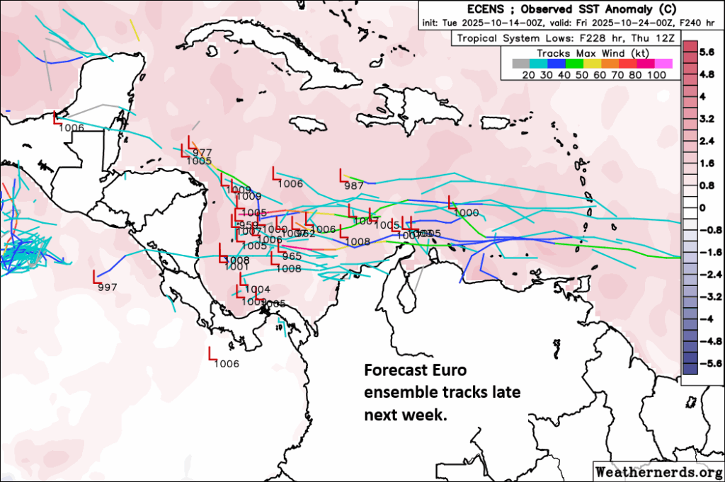 The European ensemble, along with various other modeling tools suggest that development may be possible in the southern or southwest Caribbean later next week. (Weathernerds.org)