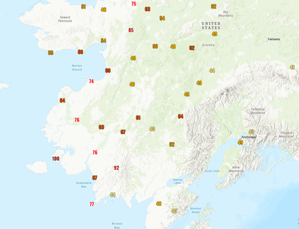 Maximum wind gusts above 40 mph on Sunday in Alaska, including a 100 mph gust on the coast at Tosook Bay. (NOAA)