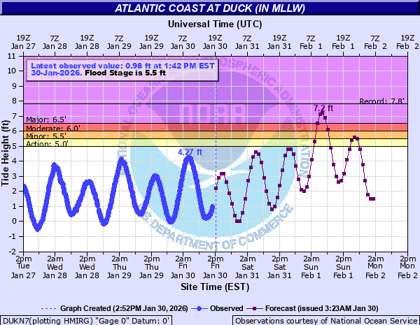 Current tidal forecasts suggest that the combination of winds and seas will lead to minor or moderate flooding on the soundside of North Carolina and major flooding on the oceanfront, particularly the farther up the coast you go. The tide forecast at Duck, NC shows a 7.2 foot tide level for Sunday morning’s high tide.