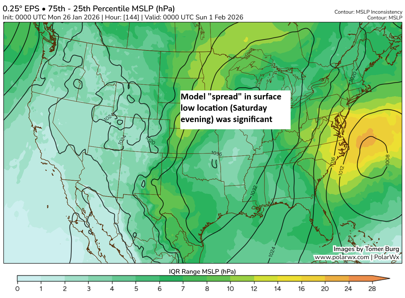 If you look at the spread in interquartile range between the 75th and 25th percentile sea level pressure forecast from back on Monday, you can clearly identify a rather large spread off the Carolina coast. The mean position of the low is actually not far off where it should ultimately locate. But in general, it was pretty evident that there was a significant degree of uncertainty. That uncertainty expanded on Monday then contracted later Tuesday and Wednesday. And now we’re focused on a southern track storm.