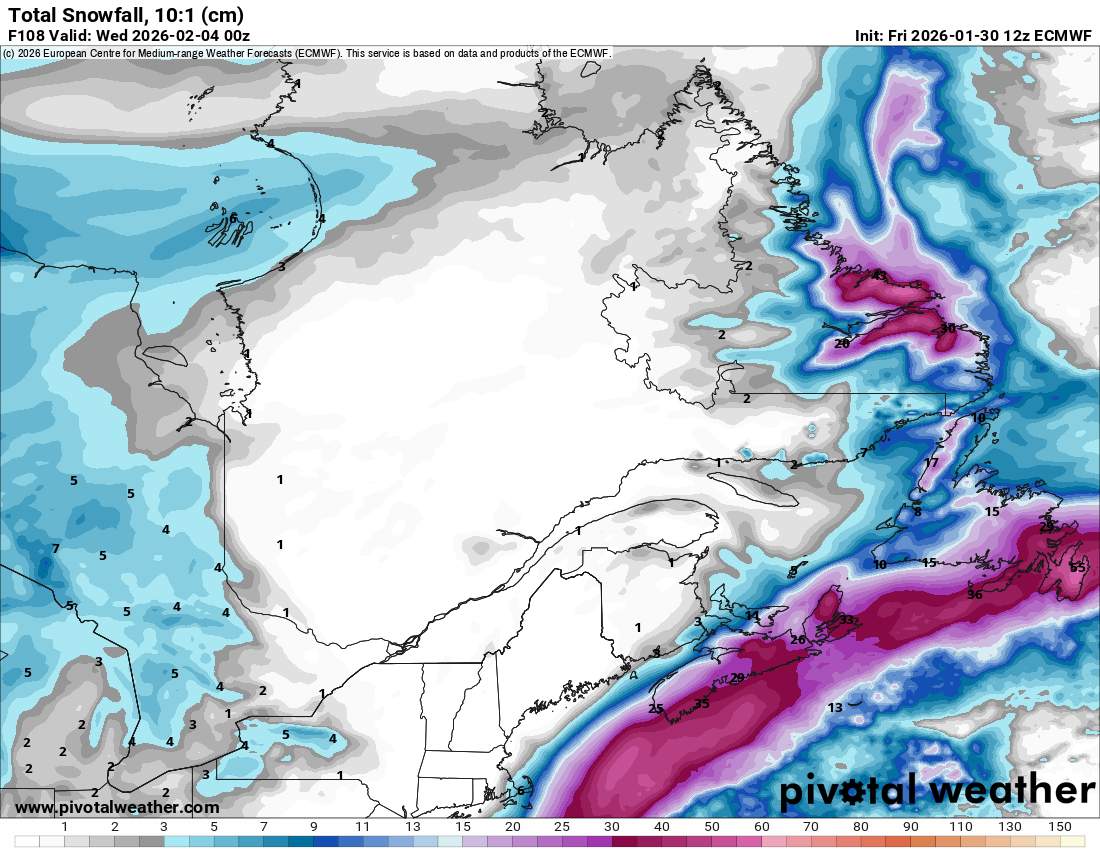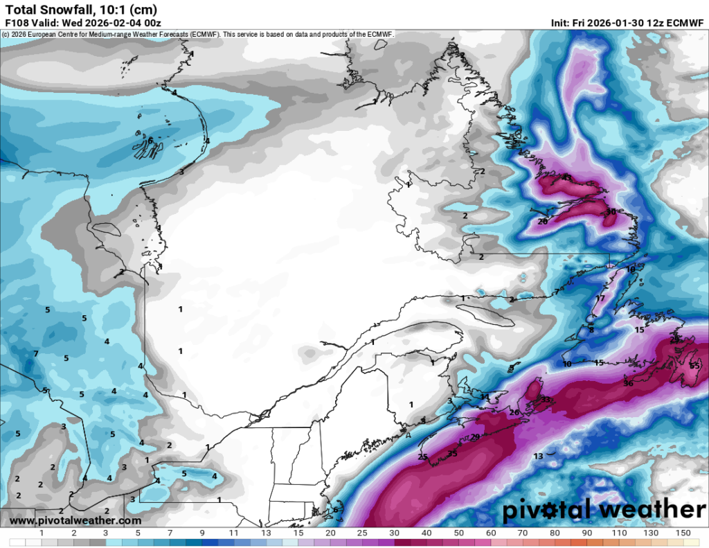 Farther north, there will be significant snow in the Canadian Maritimes as well. Anywhere from 20 to 30 cm or more of snow is likely between Nova Scotia and Newfoundland, particularly the Avalon Peninsula.