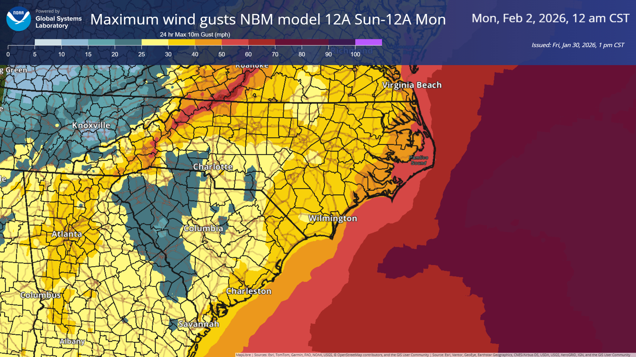 Speaking of winds, max wind gusts are expected to be on the order of 50 to 60 mph on the coast of North Carolina and Virginia.