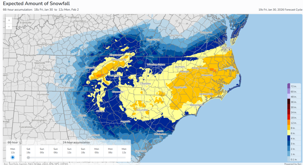 The snowfall forecast suggests a wide swath of 6 to 12 inches from Columbia, SC through Fayetteville and toward the Virginia Tidewater. There are signs of potentially higher amounts embedded within that. It is possible that we see some lower amounts too, but the probability of seeing 6 inches or more of snow is basically 60 to 70 percent or higher for the orange shaded regions. Either way, this looks like a very impactful snowstorm for the Carolinas and southeast Virginia.