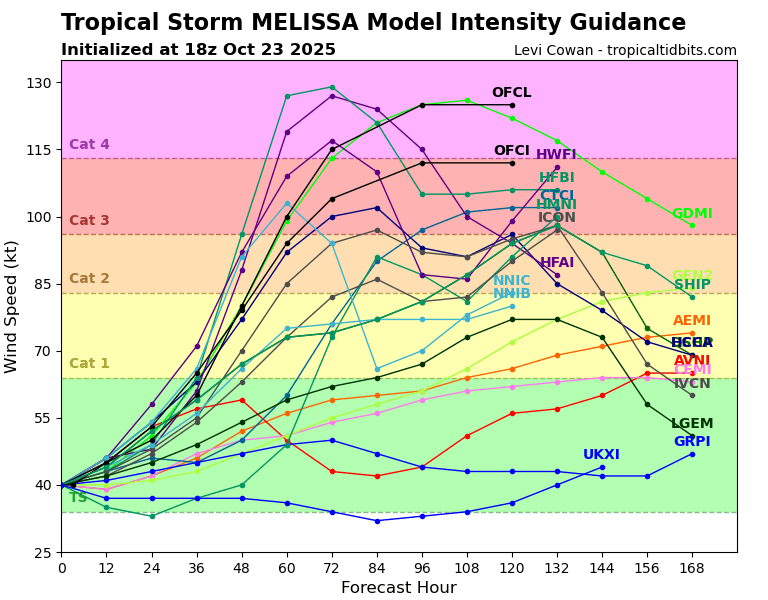 Much like the last few days, the sky is the limit with Melissa, as long as wind shear relaxes and it remains over water. With steering currents basically allowing Melissa to meander the next 18 to 36 hours, possibly northward, when they allow for a slow west drift late this weekend, it will depend on whether or not Melissa hugs the coast of Jamaica or remains offshore that will determine how strong it ultimately gets. Hurricane? Almost a guarantee. Major hurricane? Probably. Cat 4 or 5? Seems like a better than average risk. Consensus modeling puts it as a higher end category 3 storm, while Google Deep Mind and the HAFS model suite take it well into category 4 intensity. That’s where the NHC forecast sits right now, which makes a lot of sense given the environment.