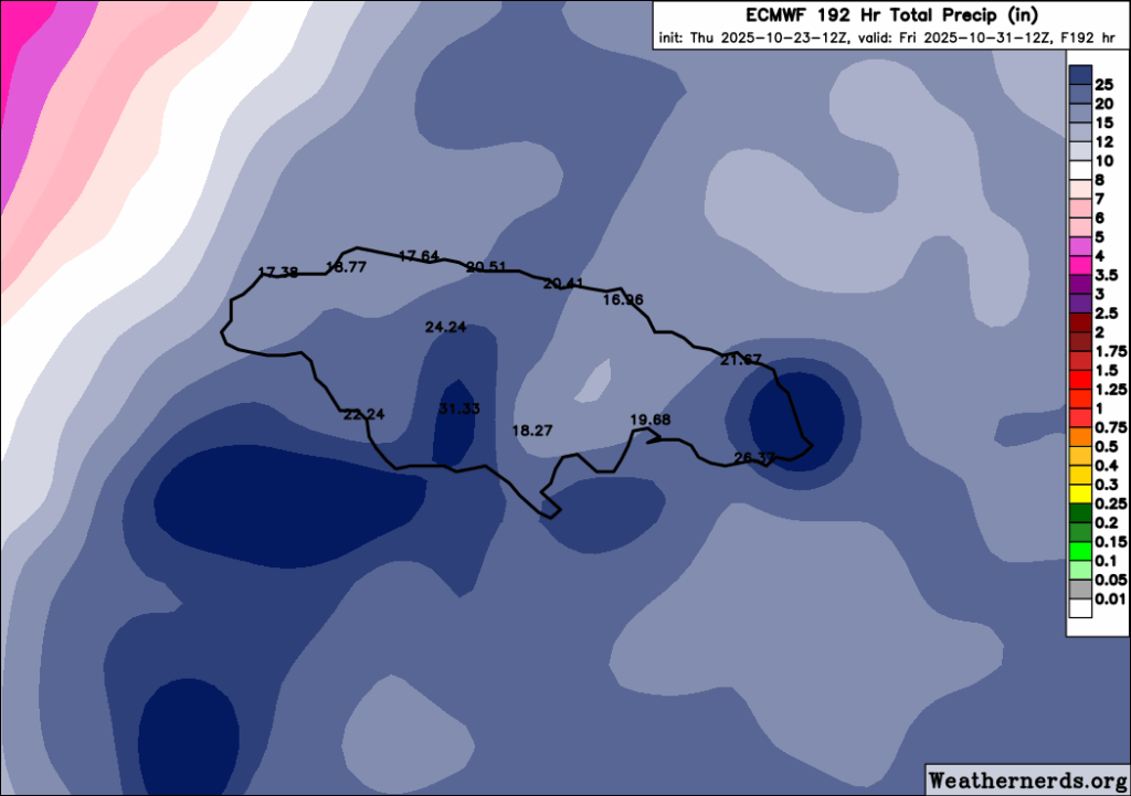 Melissa is going to be a terrible storm. There are just no two ways about this. It’s going to be hour after hour of lashing. Even if that’s not at major hurricane intensity on land in Jamaica, it will be powerful. And it will rain. A ton. I’ve shown the forecast for rain, but unfortunately because Melissa is staying at the Residence Inn and not the Holiday Inn Express, 72 hours doesn’t cover the entire forecast. Here’s a look at the forecast from today’s European model. Keep in mind that these totals will vary a bit, and the exact totals will depend on the exact track, but for Jamaica, this is absolutely horrid.