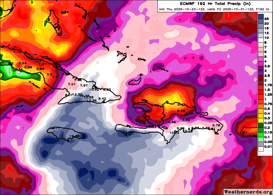 Melissa is going to be a terrible storm. There are just no two ways about this. It’s going to be hour after hour of lashing. Even if that’s not at major hurricane intensity on land in Jamaica, it will be powerful. And it will rain. A ton. I’ve shown the forecast for rain, but unfortunately because Melissa is staying at the Residence Inn and not the Holiday Inn Express, 72 hours doesn’t cover the entire forecast. Here’s a look at the forecast from today’s European model. Keep in mind that these totals will vary a bit, and the exact totals will depend on the exact track, but for Jamaica, this is absolutely horrid.