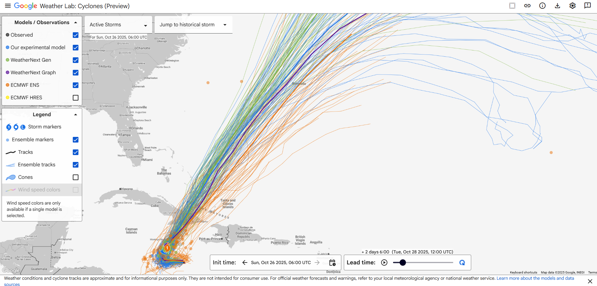 In brief: Melissa’s forecast has not changed much at all since yesterday unfortunately. The storm should slowly crawl south of Jamaica through tomorrow before turning north and hitting the middle of the island directly as a high-end major hurricane, possibly the strongest in Jamaica’s known history. Catastrophic impacts from surge, wind, and multiple days of torrential rain are likely. A slightly less intense (but likely still major hurricane) storm will hit eastern provinces of Cuba on Tuesday night and Wednesday morning with severe impacts. Significant impacts are likely in the southeast Bahamas and perhaps Turks and Caicos Islands as a borderline major hurricane passes by on Wednesday. Bermuda should remain on alert for tropical storm or hurricane impacts by Friday.