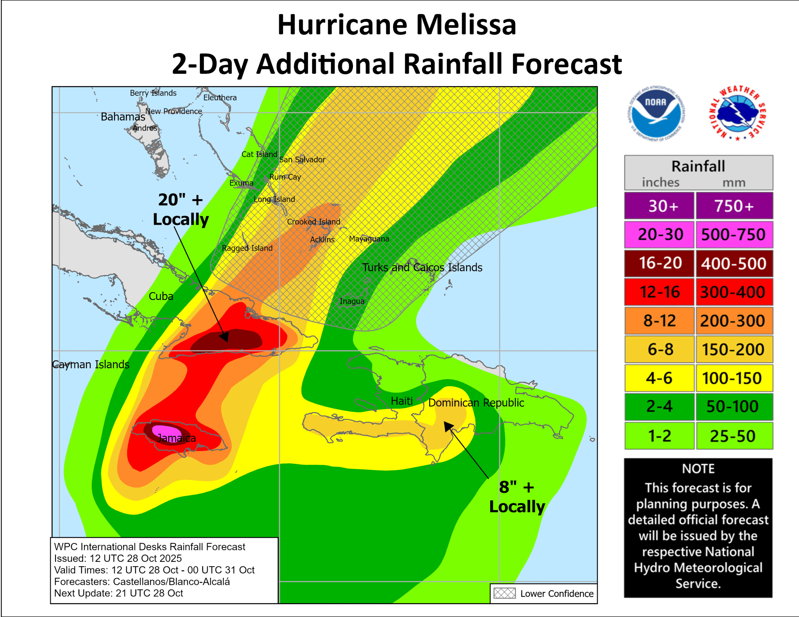From here, the next stop is Cuba, and we continue to see strong support for a landfall just to the west of Santiago de Cuba, the second largest city in the country. Jamaica will take a big bite out of Melissa for sure, though the center should pass just west of the highest terrain and over a relatively narrower part of the island. I would anticipate that a category 3 or 4 storm is likely to hit Cuba tomorrow morning. As previously noted, this looks worse than Sandy and potentially the worst on record in eastern Cuba. The worst winds should pass to the west of Guantanamo Bay. But heavy rain and significant flooding are likely with over 20 inches more rainfall possible there.