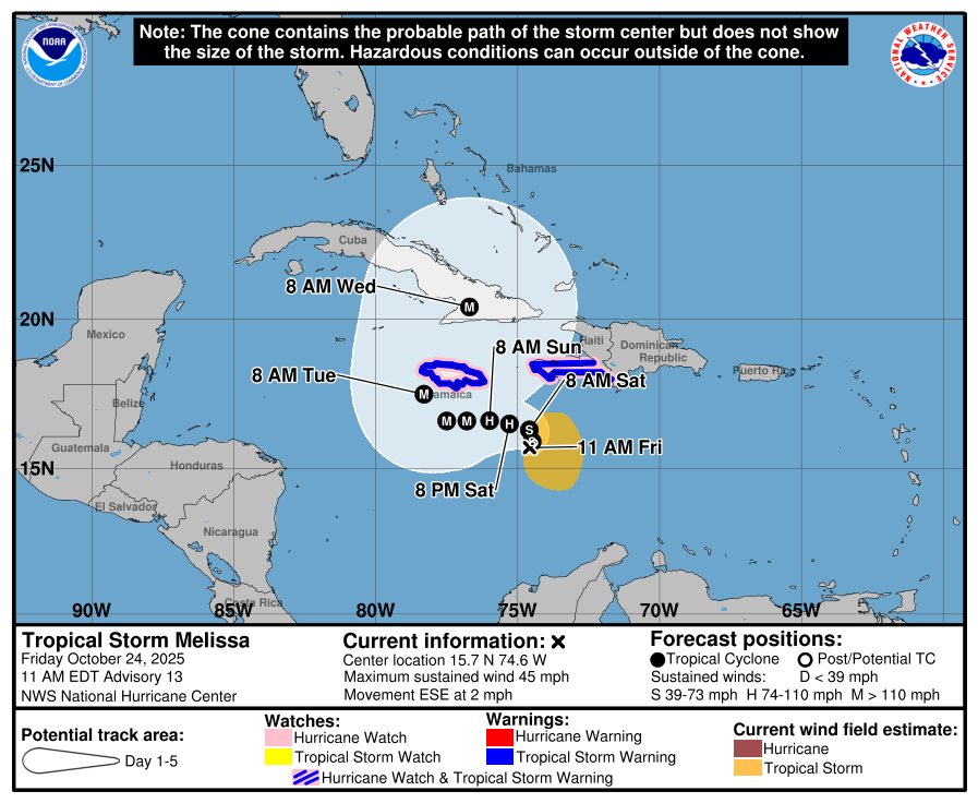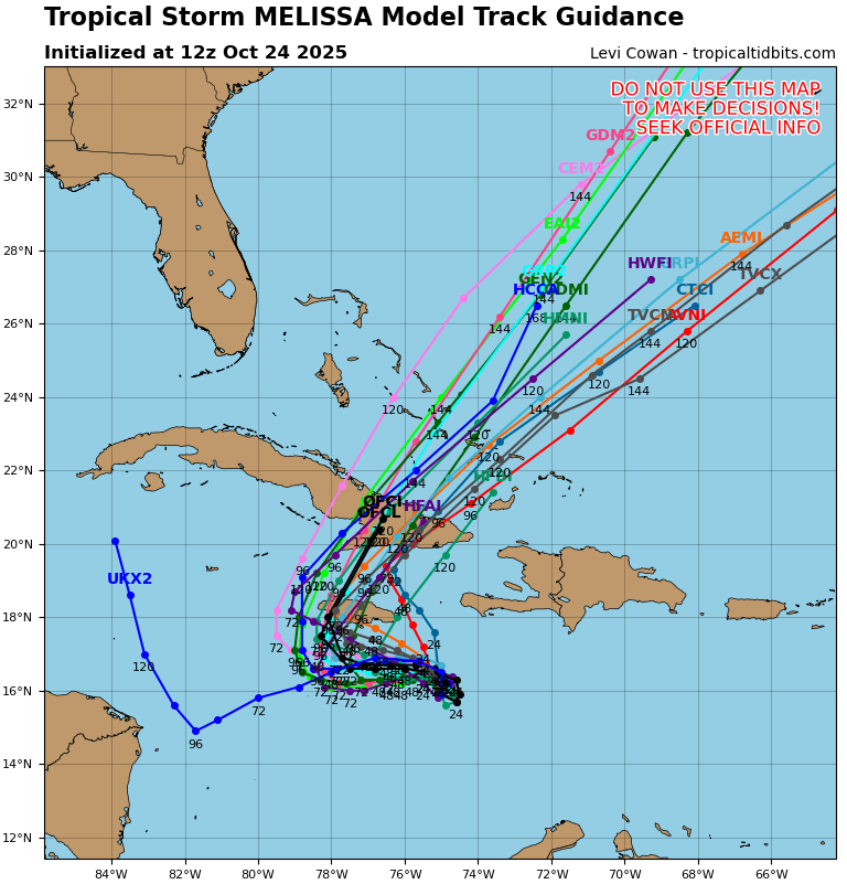 In brief: Tropical Storm Melissa’s forecast has undergone mostly cosmetic changes this morning. A damaging, severe hurricane with wide-ranging impacts in Haiti, Jamaica, and Cuba is likely. We continue to be focused on heavy rainfall and multiple days of hurricane impacts in very vulnerable locations. But the story is mostly unchanged today.