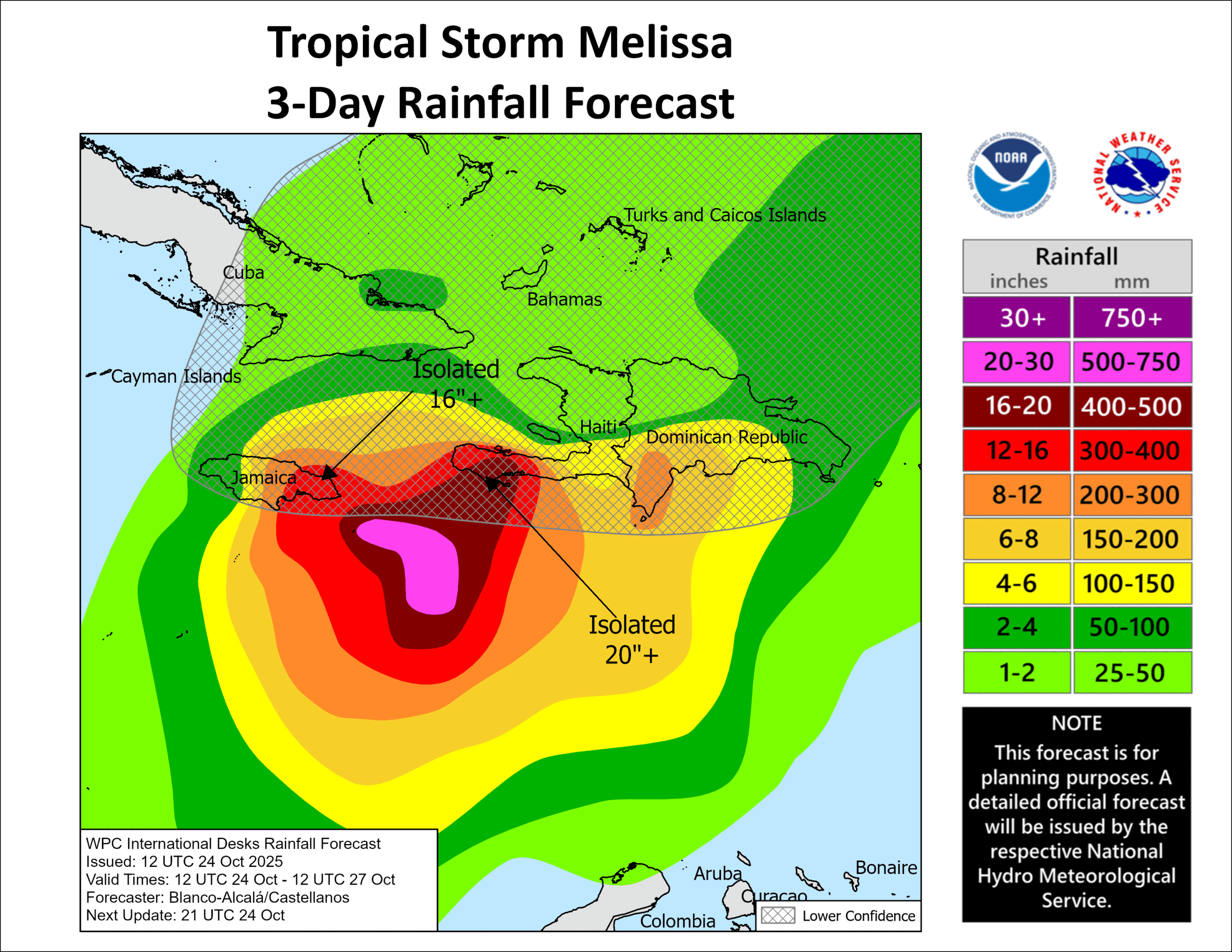 In brief: Tropical Storm Melissa’s forecast has undergone mostly cosmetic changes this morning. A damaging, severe hurricane with wide-ranging impacts in Haiti, Jamaica, and Cuba is likely. We continue to be focused on heavy rainfall and multiple days of hurricane impacts in very vulnerable locations. But the story is mostly unchanged today.