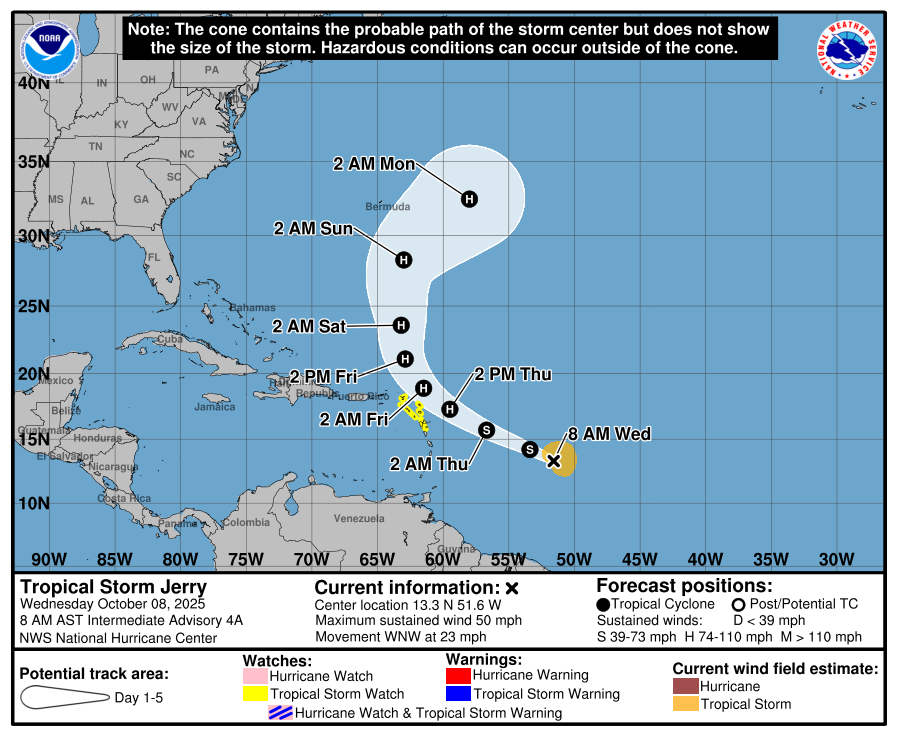 Jerry will begin approaching the northeast Leeward Islands on Thursday afternoon. As it does so, it will slow down, preparing to turn more northward. As this happens, the storm should begin to put itself together better, which will lead to a burst of intensification. Because of the close proximity of the forecast track of Jerry and the likelihood that the storm will strengthen, a Tropical Storm Watch has been issued for a pile of islands: Antigua, Barbua, Anguilla, St. Kitts & Nevis, Montserrat, St. Barthelemy, St. Martin, Saint Maarten, Saba, St. Eustatius, and Guadeloupe.