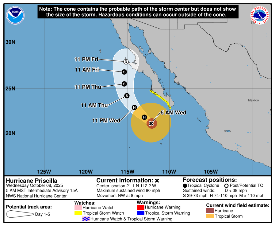 Hurricane Priscilla is weakening after topping out as a major storm. It should be dropping below hurricane intensity later tonight.