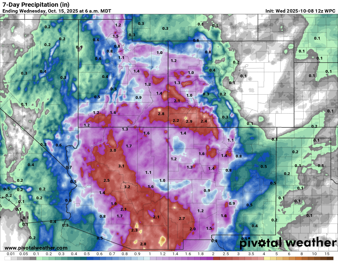 Some models show potential for even higher amounts than this in localized spots. I would expect flood watches to be posted by tomorrow for much of this region, so while the rain is mostly welcome in the long-term here, this could cause some short-term problems, particularly in Arizona and near the Four Corners.
