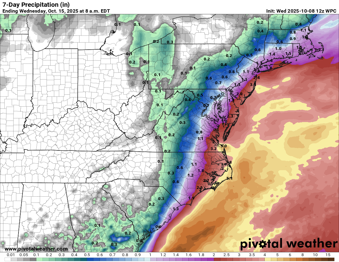 Heavy rain from this weekend’s coastal storm is likely from the Carolinas into New England, particularly along the immediate coastline. (Pivotal Weather)