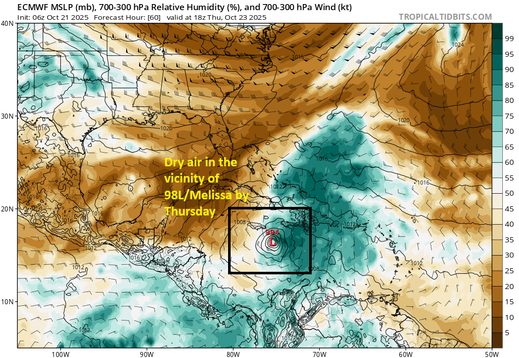 In brief: Invest 98L should become Tropical Storm Melissa by later today. It is going to slam on the brakes and meander in the central Caribbean for several days, with potential to become a strong hurricane. It will also be a tremendous rainmaker for somewhere, depending on exactly where it stalls out. Interests from Jamaica and Cuba, across Hispaniola, and into western Puerto Rico should continue monitoring Invest 98L.