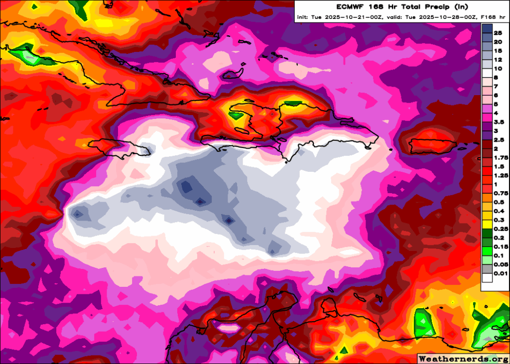 An aspect that needs to be addressed? Rainfall. The stall position will have a tremendous impact on how much rain falls in parts of the Caribbean. For example, the European model stalls the storm east of Jamaica and drifts it west through day 7. Thus, you see a substantial amount of rain (8 to 12 inches or 200-300 mm) in eastern Jamaica, southern Haiti, and the southern Dominican Republic. If the storms stalls closer to Hispaniola, you could be talking 15 to 20 inches of rain or more in spots there.