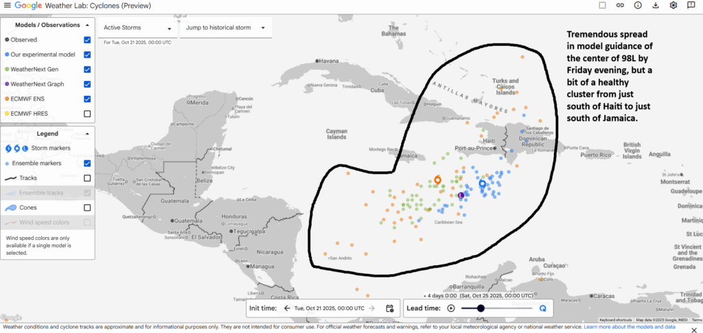 Now, that said, the red hot Google AI model seems to favor a position mostly south of Haiti, while the historically decent European ensemble is much more strung out between the Colombian isle of San Andres and the Turks and Caicos Islands. But even the AI modeling sees a widening spread in outcomes beyond Friday. A couple things do stand out in the model guidance today, the signal in the noise if you will. First, slow movement. The system is going to meander it appears, and I think the idea of a rapidly turning and moving storm into the Turks and Caicos by Friday or Saturday is unlikely at this point. Second, intensification. It would seem that with slower movement over a toasty Caribbean will produce steady intensification over the next 5 days. Rapid intensification is possible. We could be looking at a major hurricane by the weekend sitting somewhere south of Hispaniola or southeast of Jamaica.