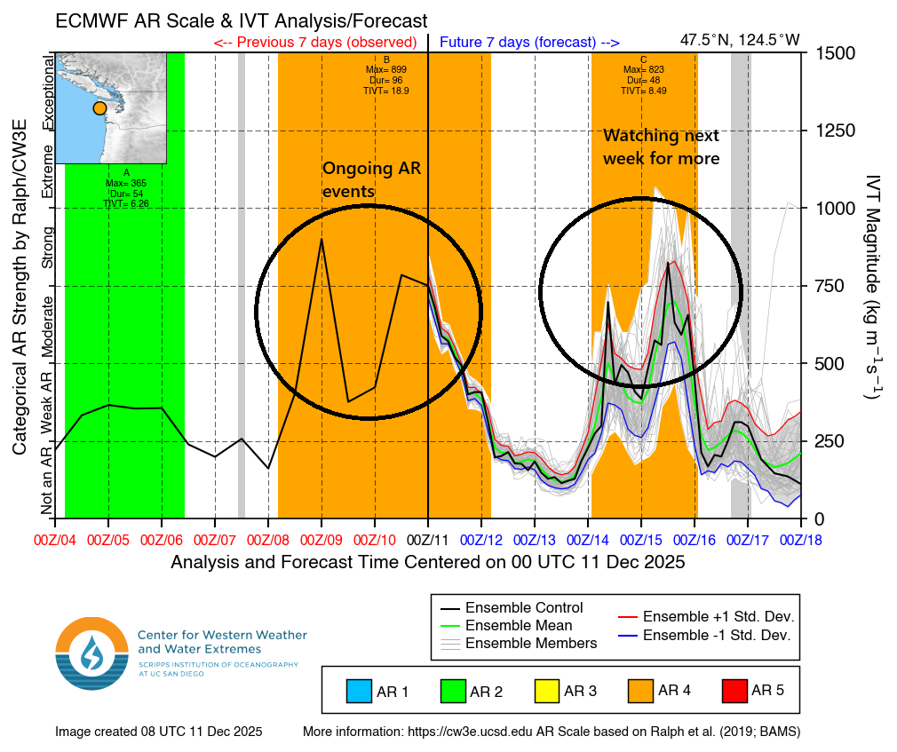 As things settle down tomorrow and Saturday, our attention will shift to the next AR event, which looks poised to crash ashore beginning on Monday or Tuesday. This one will start quite warm as well, but fortunately it does look like temperatures will drop off a good 5 to 10 degrees compared to the ongoing event. This should lower snow levels down to more typical elevations and lead to less of a full-scale runoff event like the ongoing one. Still, we will probably be looking at a fair bit of precipitation from this event.